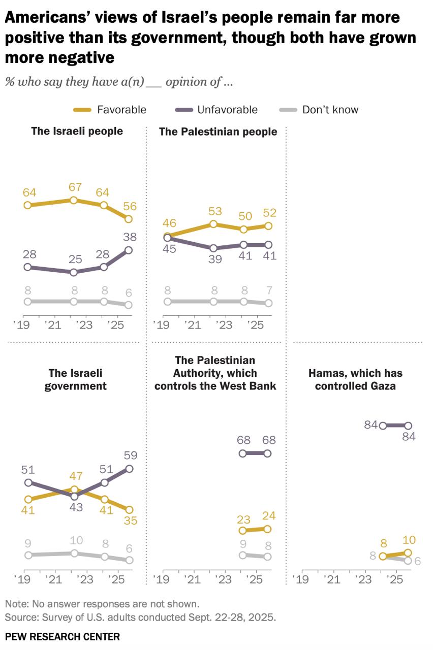 Более важная причина - усиливающийся раскол самой Америки из-за ближневосточного кризиса. Вышел ещё один опрос, фиксирующий негативное отношение к политике Израиля со стороны большинства американцев. Речь идёт о львиной доле демократов и части республиканцев.